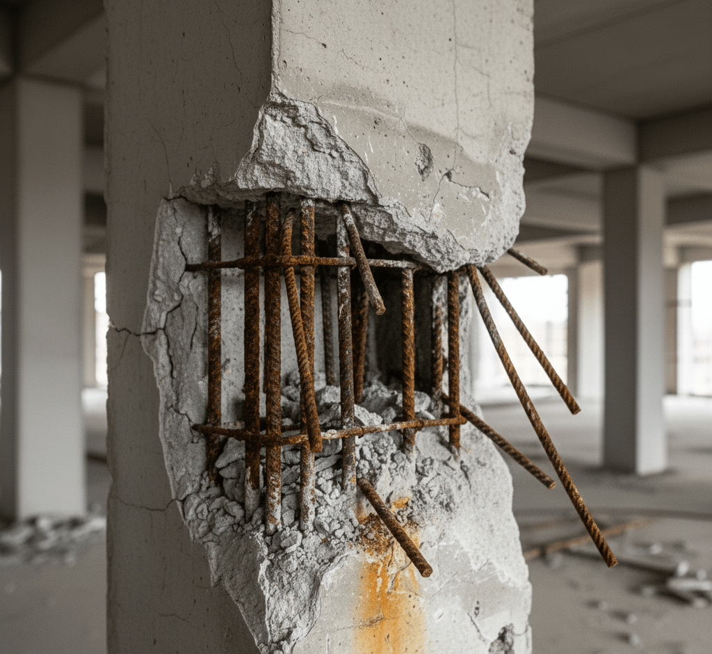Falha crítica em pilares, lajes e vigas por sobrecarga ou baixa resistência.
